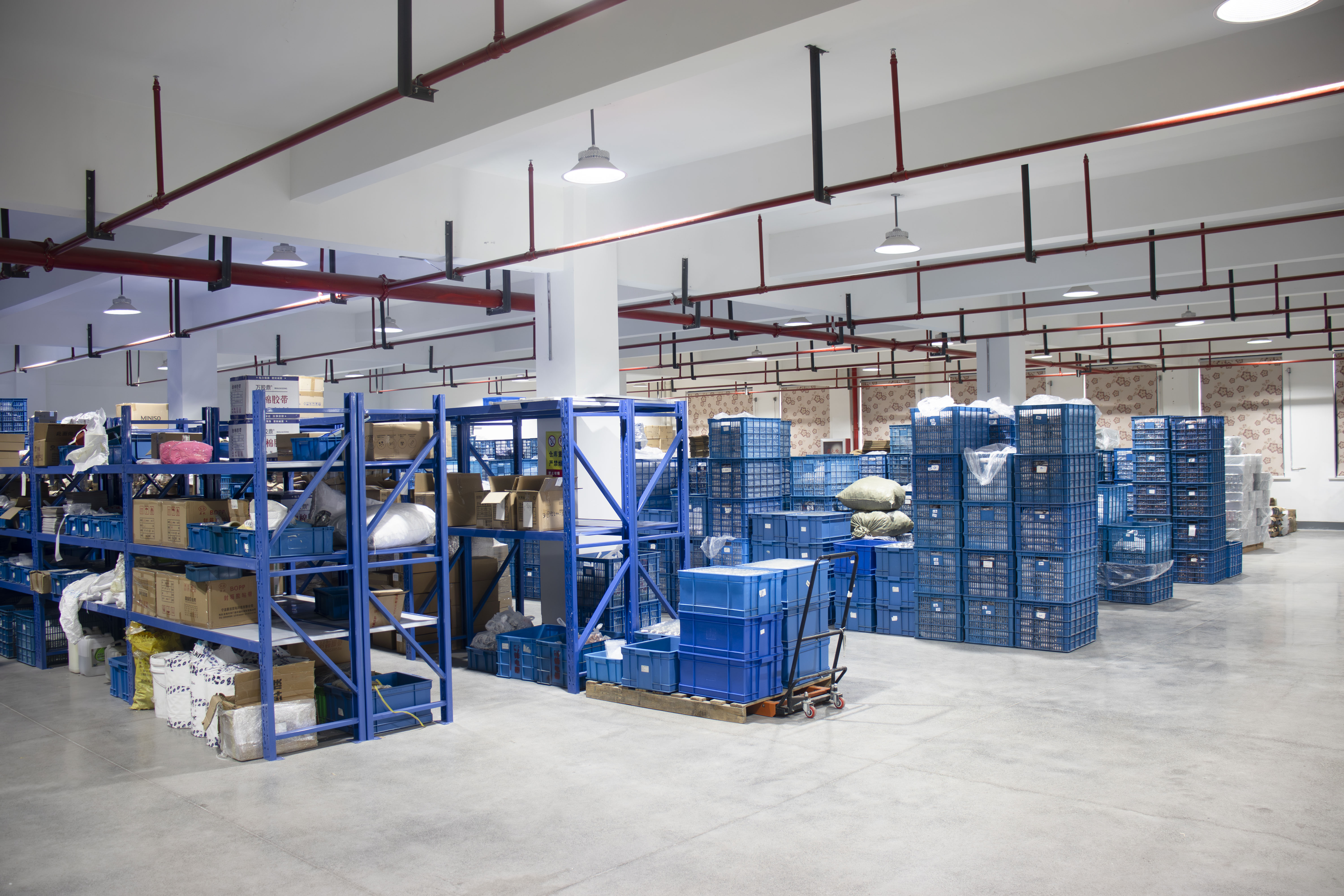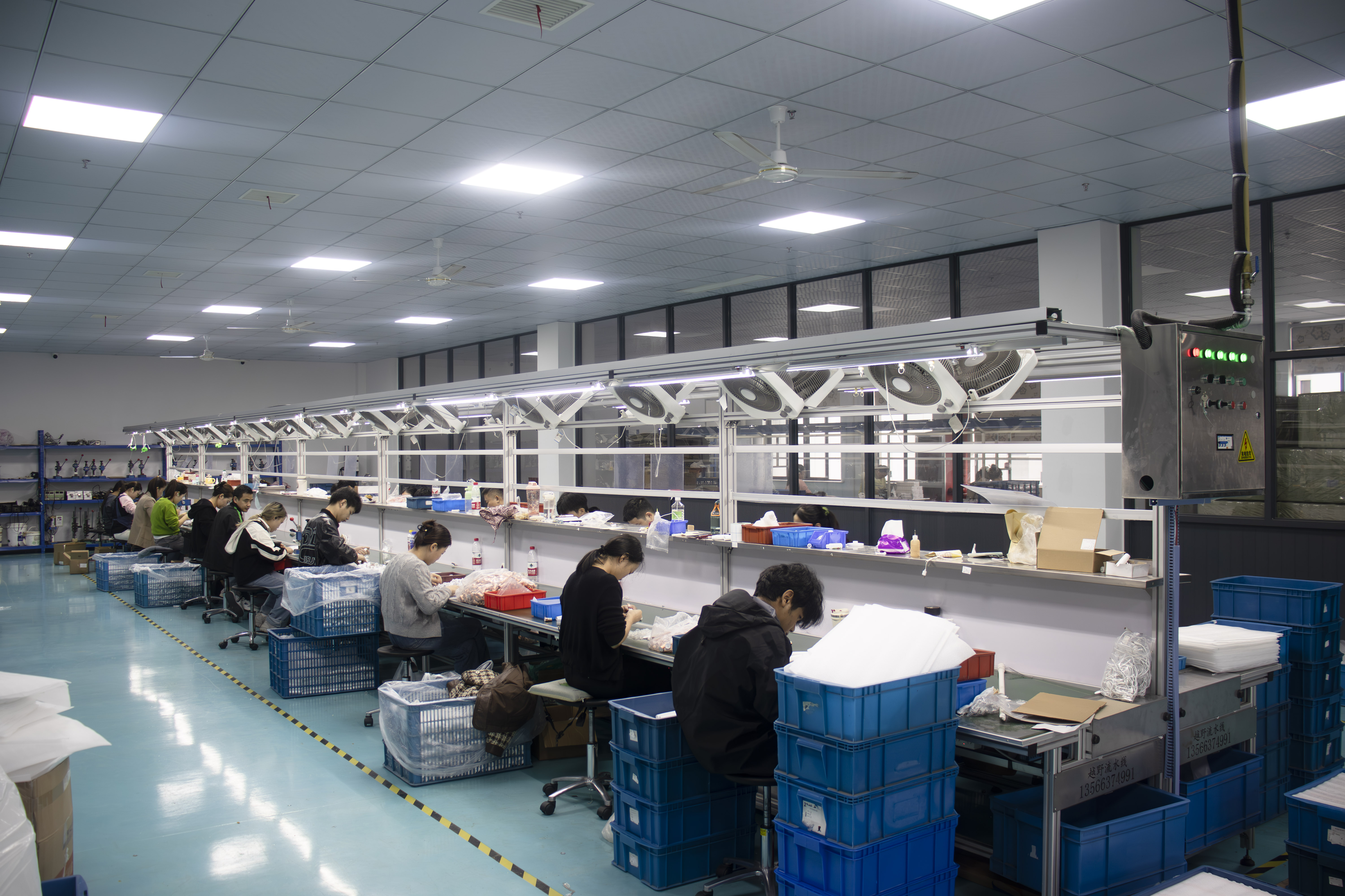 Radionica sadrži svijetloplave epoksidne podove sa žutim linijama razgraničenja, jasno definirajući radna područja i materijalne kanale. Komponente su kategorizirane u plavim kantama za skladištenje, dok su radne stanice montaže opremljene rasvjetom bez sjene i industrijskim ventilacijskim sustavima. Stražnje višeslojne police skladišta proizvodne materijale, sinkronizirane s kontrolnim terminalima za praćenje upotrebe materijala u stvarnom vremenu i minimiziranje zastoja.